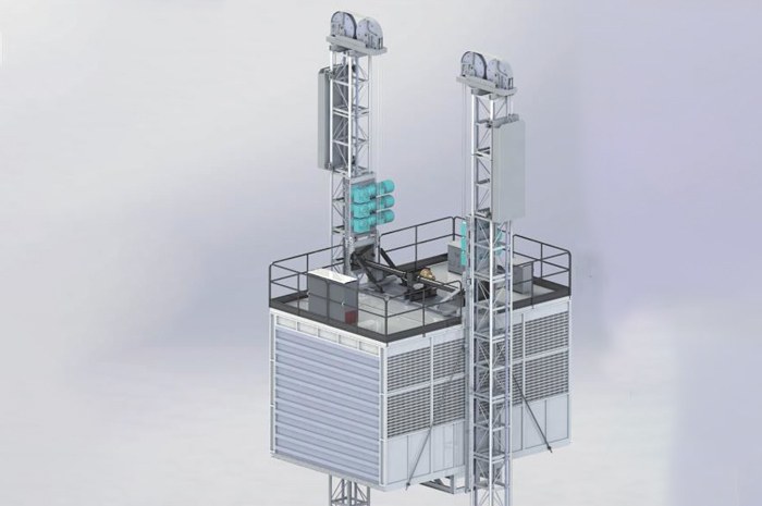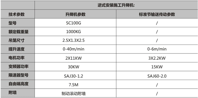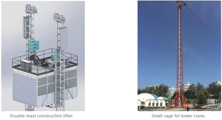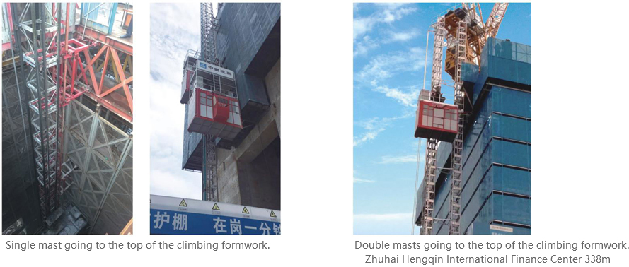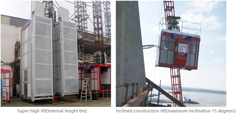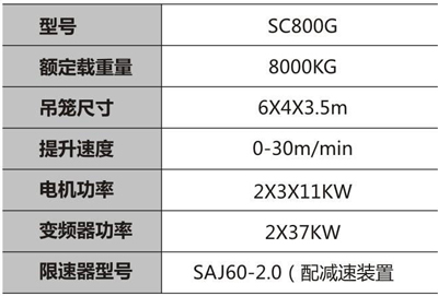 SC SERIES SPECIAL MODELS SC800G double mast construction lifts: 1. double guide rail structure, elevator adopts frequency conversion control and runs smoothly. 2. special speed limiting device, synchronize and stop both ends of a speed limiter. 3. super large cage for large and heavy cargo.