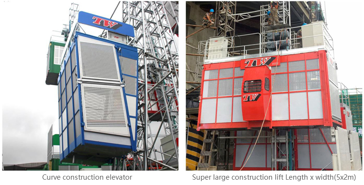SC800G double mast construction lifts: 1. double guide rail structure, elevator adopts frequency conversion control and runs smoothly. 2. special speed limiting device, synchronize and stop both ends of a speed limiter. 3. super large cage for large and heavy cargo.