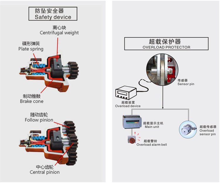 SC construction lifts have perfect and reliable electrical and mechanical interlocking safety devices: door safety switch, upper and lower limit switch, limit switch, anti-top switch, safety protection hook and anti-fall safety device. Overload protector is also configured according to requirements